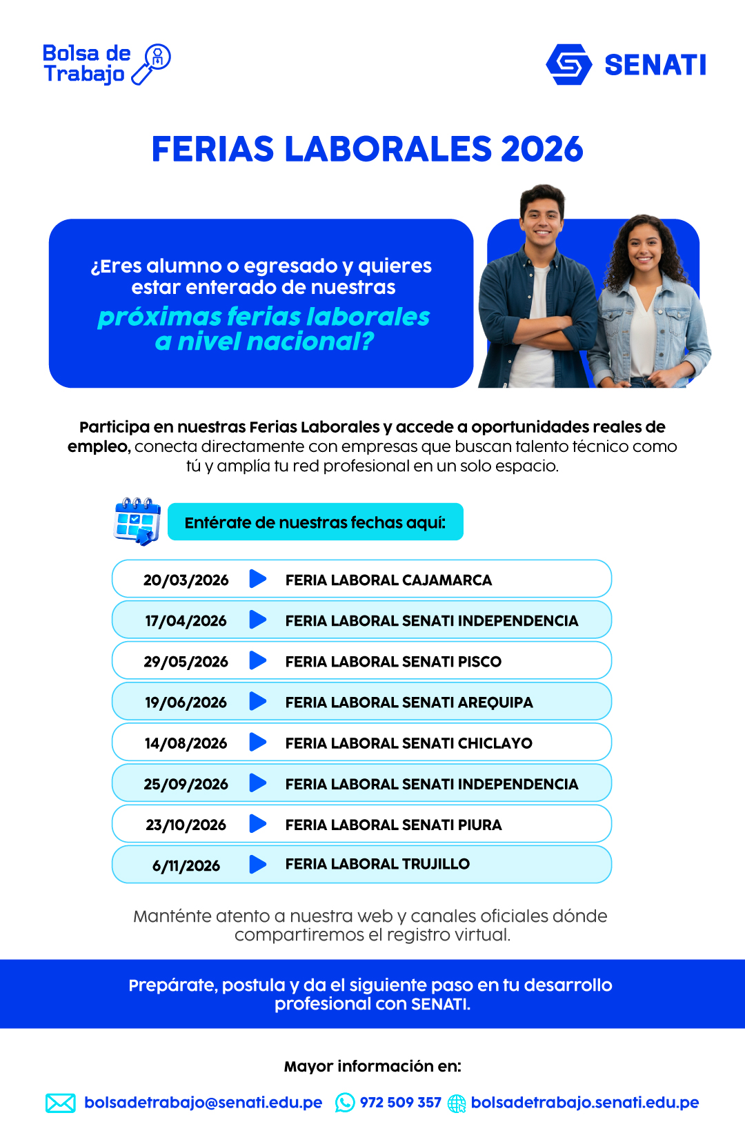 Conoce las fechas de nuestras próximas ferias laborales y participa para acceder a cientos de vacantes pensadas para talentos de SENATI como tú.